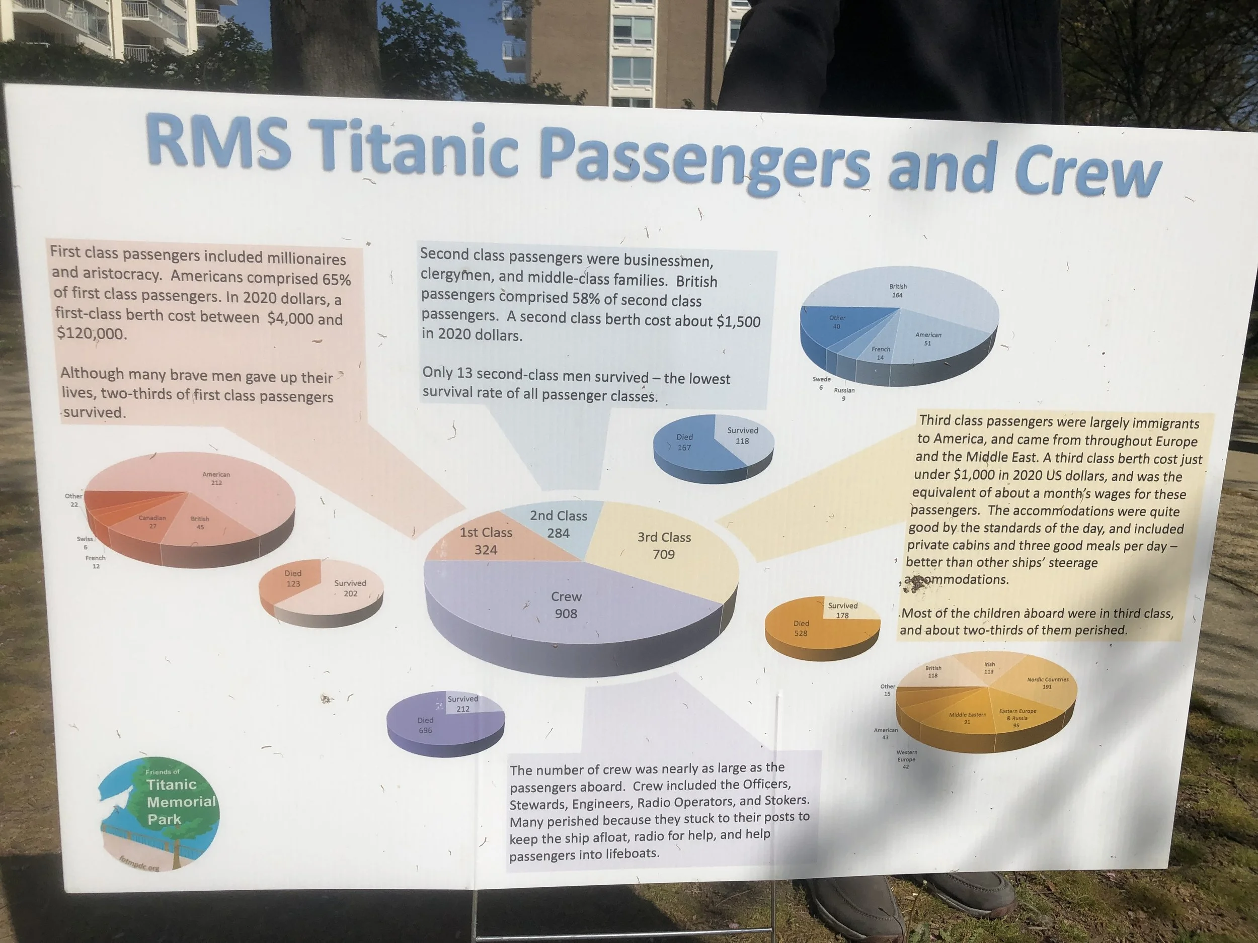 As I mentioned, yesterday, April 15, marked the 110th anniversary of the Titanic tragedy. There was a wreath-laying ceremony. A number of people brought flowers. There was a number of placards installed in the memorial park dedicated to the lives and memory of some of the victims and survivors.